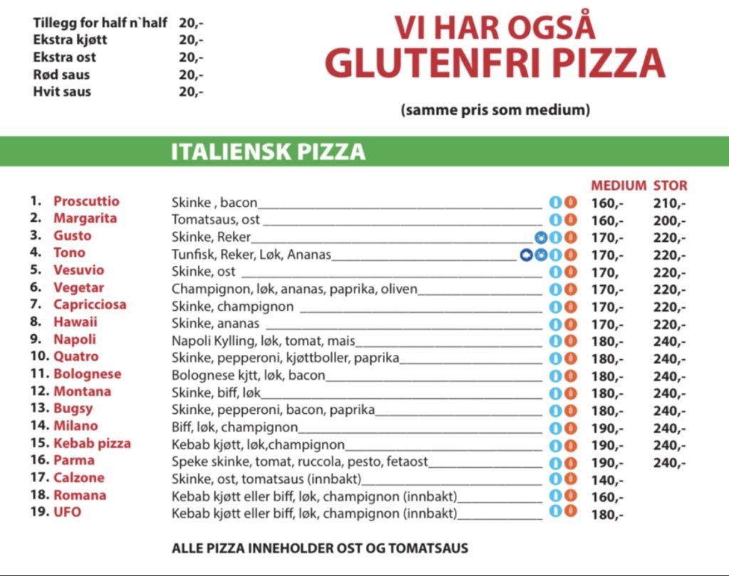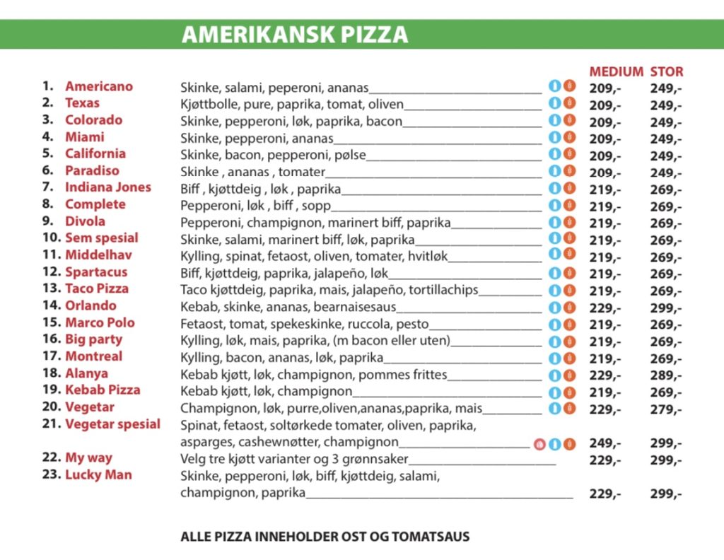 Merk at priser i restauranten kan variere noe fra takeaway-prisene.